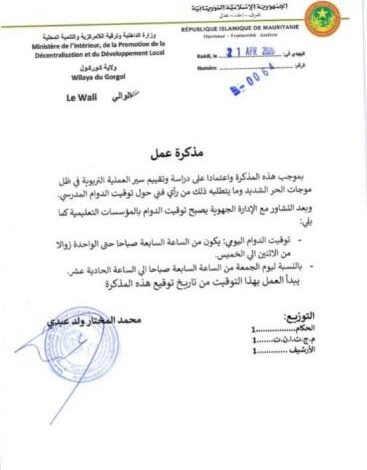 الأصالة:  تقرر بموجب مذكرة عمل وقعها والي كوركول محمد المختار ولد عبدي اليوم الثلاثاء تغيير ساعات الدوام المدرسي بعموم الولاية.