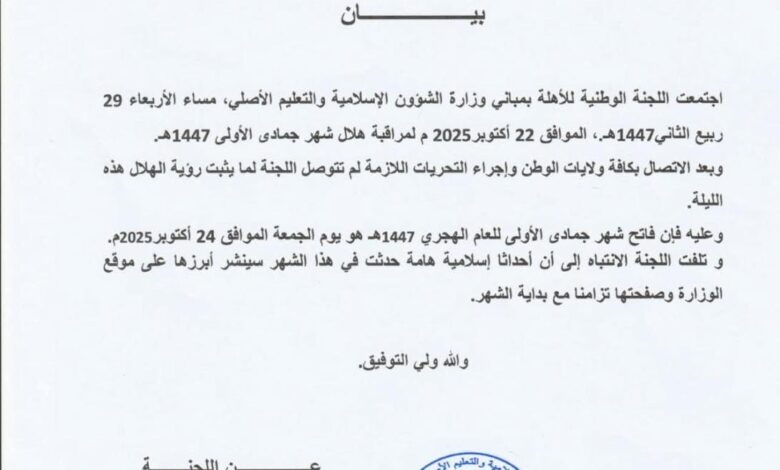 الأصالة: قالت اللجنة المركزية لمراقبة الأهلة إنها لم تتوصل لما يثبت رؤية هلال شهر جمادي الأولى من العام الهجري 1447.