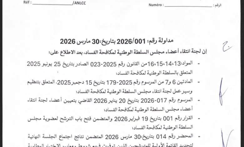 وفقا لنص المداولة، قررت اللجنة منح مهلة ستة أيام ابتداء من يوم الثلاثاء 31 مارس 2026، تتيح من خلالها للمترشحين والجمهور العام تقديم ملاحظاتهم وآرائهم حول هذه القائمة.